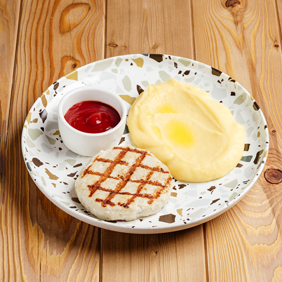 Куриная котлета гриль, картофельное пюре, кетчуп. Вес блюда: 80/70/30 г.