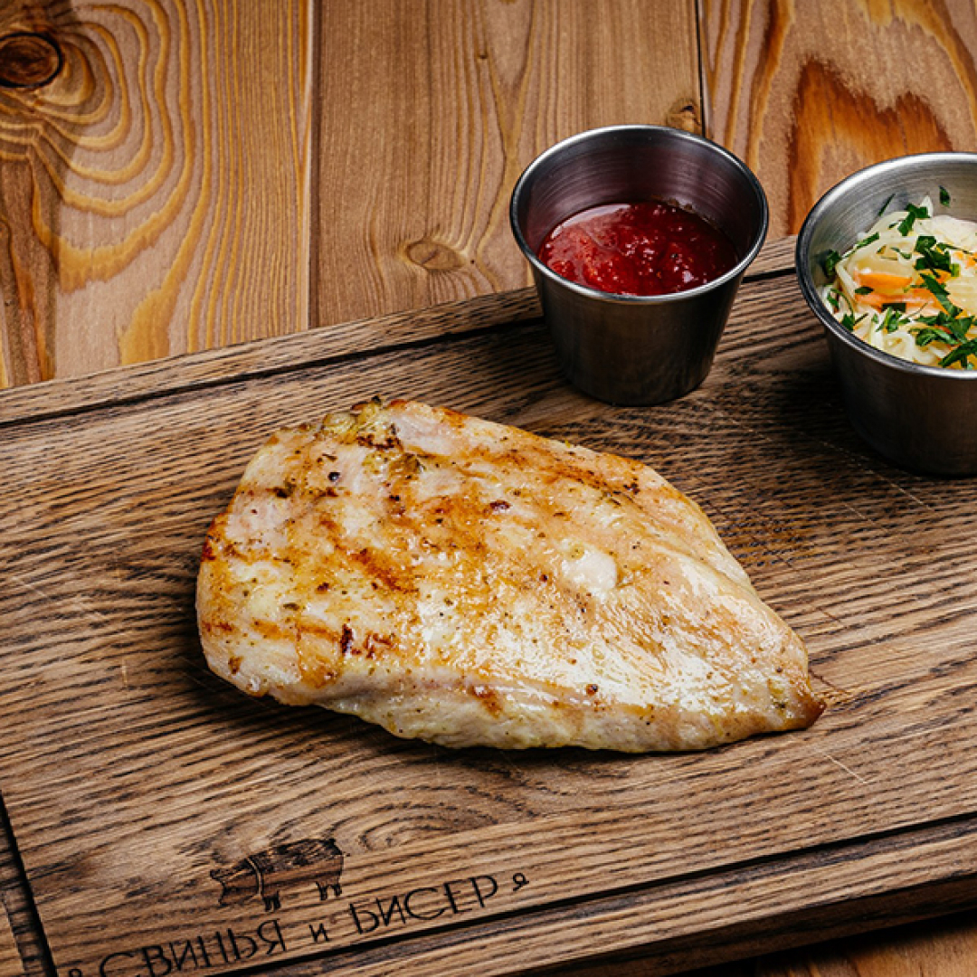 Куриная грудка, специи, салат коул-слоу, острый томатный соус сацебели. Вес блюда: 160/60/30г