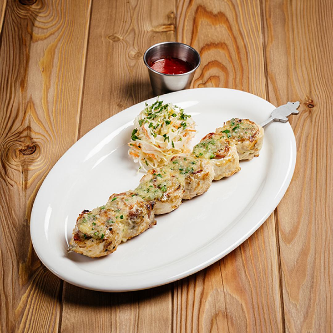 Куриный фарш с добавлением сала, салат коул-слоу, острый томатный соус сацебели. Вес блюда: 160/60/30г