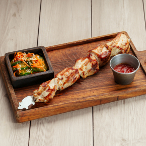 Куриная грудка, специи, салат коул-слоу, острый томатный соус сацебели. Вес блюда: 160/60/30г