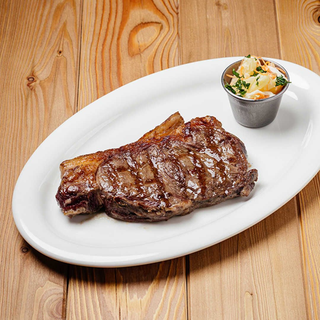 Стейк из мраморной говядины толстый край. Соус чимичури: оливкое масло, петрушка, кинза, перец чили, чеснок, соус шисо, соус свит чили, сок лайма, соль.