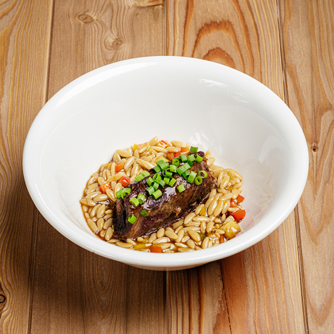 Паста орзо, телячьи щёчки, цукини и болгарский перец на гриле, соус грейви, зелёный лук