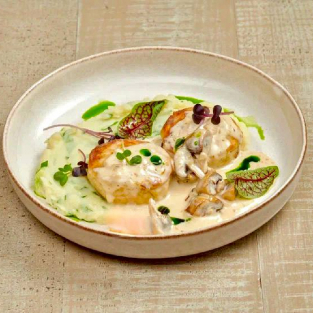 Куриное филе, куриное яйцо, панировочные сухари, картофельное пюре, лук фри, сливки, жареные шампиньоны, зеленый лук, микс зелени.
