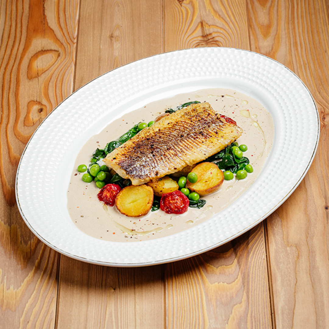 Пелядь, мини-картофель, шпинат, томаты черри, зелёный горошек, сливочно-мясной соус