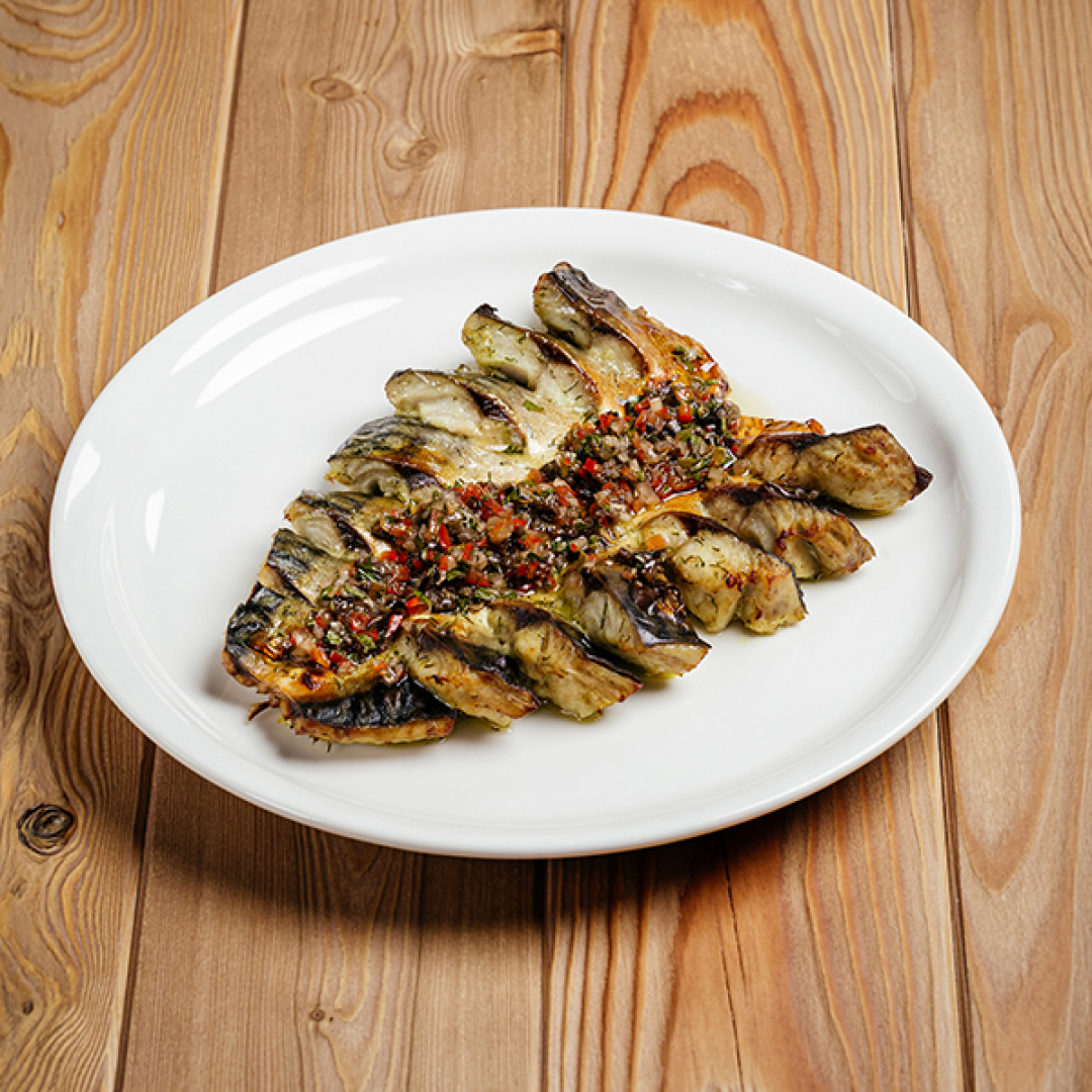 Запечённая скумбрия под овощной подушкой из маслин, красного лука, болгарского перца, чеснока, петрушки и каперсов