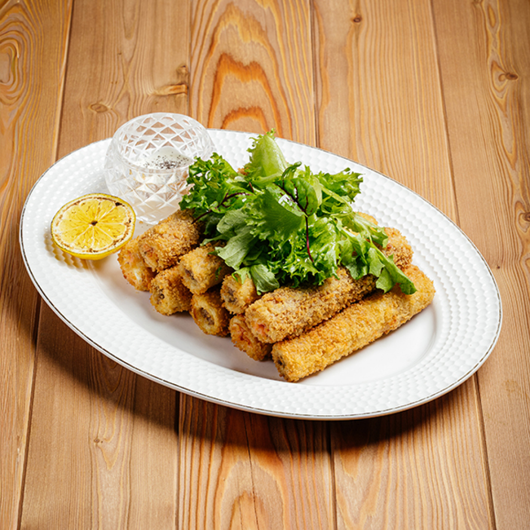 Кальмар, филе сёмги, тигровые креветки, котлеты из щуки, соус из моллюсков, лимон, укроп, петрушка