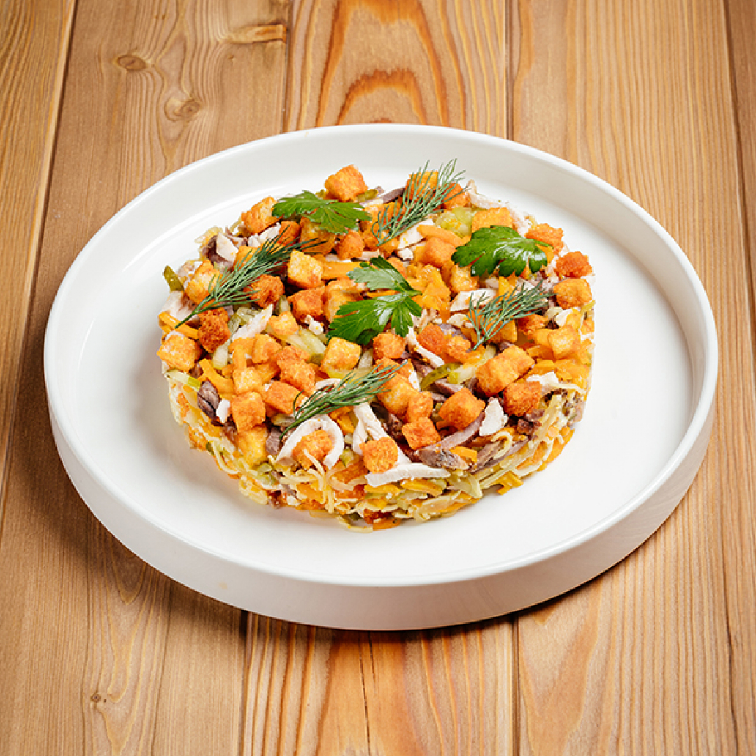 Телятина, копчёная курица, сыр гауда, морковь, лук, молочные сухарики, заправка на основе майонеза и маринованных огурчиков