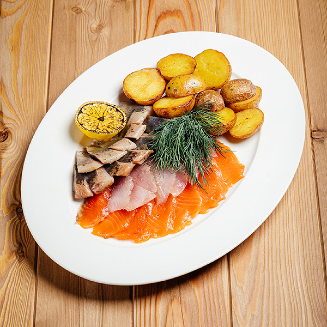 Сельдь с укропом и лимоном, сельдь в томатном соусе, малосоленая пелядь, филе форели малой соли, молодой картофель во фритюре, лимон, укроп