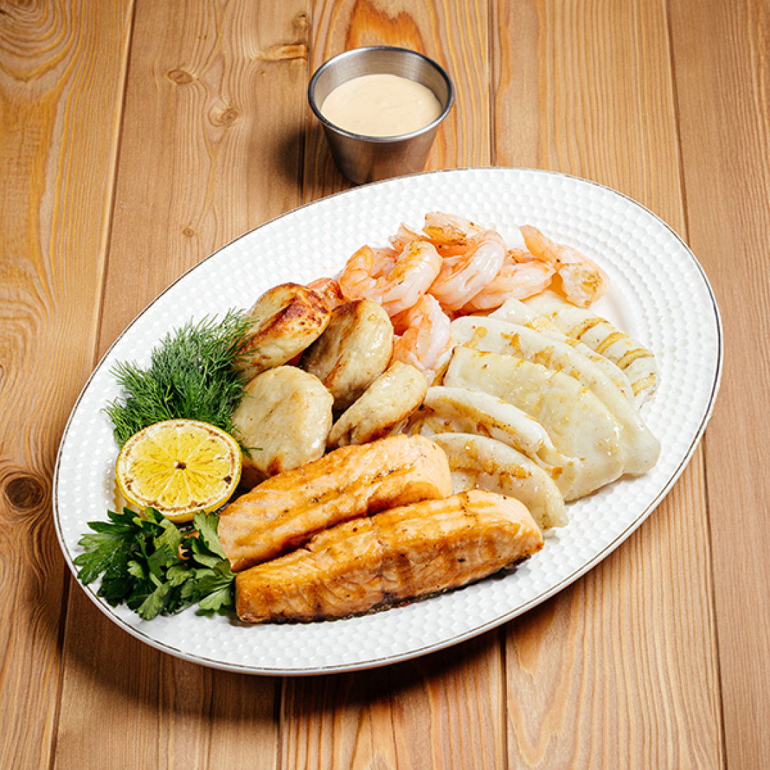 Кальмар, филе сёмги, тигровые креветки, котлеты из щуки, соус из моллюсков, лимон, укроп, петрушка