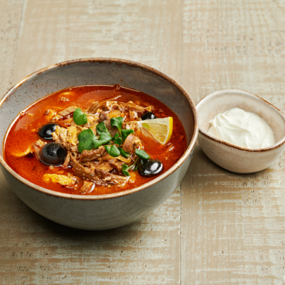 Копчёные куриные колбаски с паприкой, копченые колбаски из свинины и говядины острые, буженина, язык, копчёное куриное филе, говяжий бульон, каперсы, консервированный огурец, оливки без косточки, лимон, томатная паста, сметана, укроп. Вес блюда: 350/30г