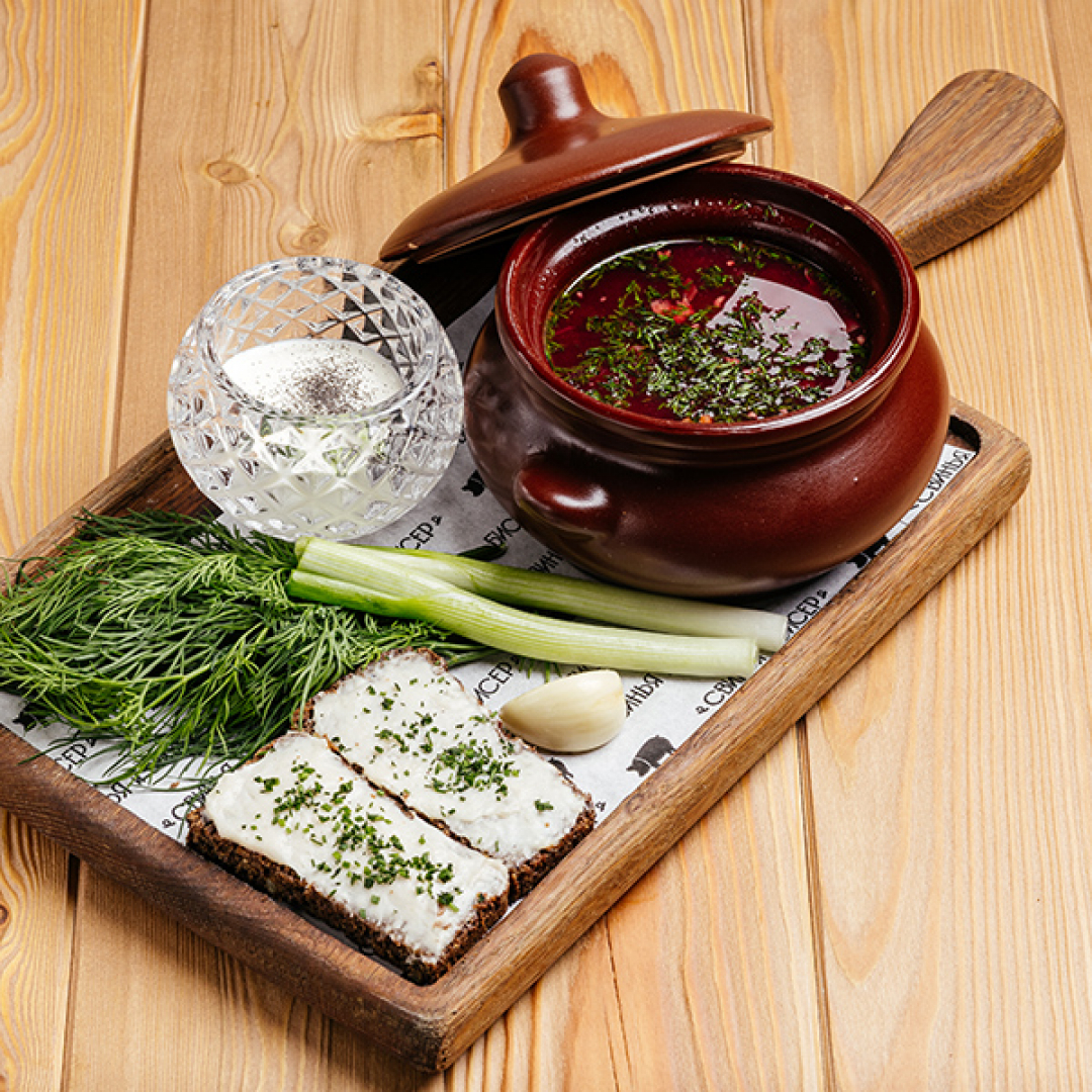 Говяжий бульон, говядина, лук, свёкла, томатная паста, картофель, морковь, чеснок, зелень, лук зеленый, сметана, горчица, сало соленое