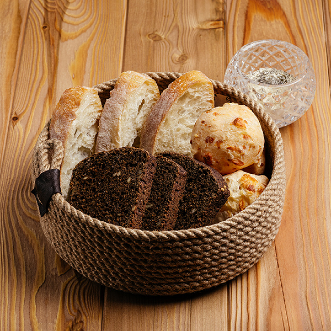 Хлеб на пшеничной муке и хмелевой закваске с добавлением семян подсолнечника, тыквы, льна. Черный бородинский хлеб на ржаной муке и хмелевой закваске с добавлением семян подсолнечника, кориандра, меда. Две сырные булочки. Сливочное масло продолжительного томления с морской солью и кунжутом.